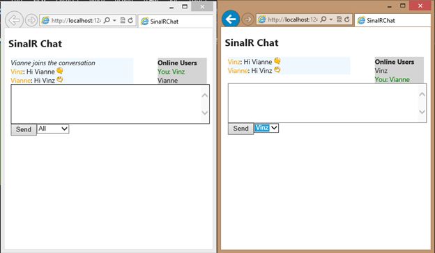 The showModalUserNickName() function calls the jQueryUI dialog. This function will be called when the browser is loaded to prompt the user to enter their name before joining the chat room. After entering their name the startChatHub() function will be called. This function is where the actual implementation of the chat is defined. The logic is that it first creates a proxy connection to the Hub (ChatHub). Once connected, we then have access to the public methods defined in our Hub class. The next step is to get the name of the user. If the user already exists in the dictionary then they will be prompted to enter another name. Then it will call the Notify() method to add the new user to the dictionary and notify other users that someone has joined the chat room. The next function updates the message logs, available users and the online user’s panel when someone joins the room. Then it calls the broadcastMessage() function to display the messages among users in the message logs. You will also see that I’ve added some code within that function that will interpret smileys. The client.disconnected() function is responsible for updating the UI and the list of users when someone leaves the chat room. And finally call the hub.start() function to start the connection between the client and the hub (server). This method contains the implementation of sending the message to other users or specific users.