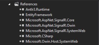 Now click the Install button to add the SignalR library and its dependencies into your project. Just follow the procedure specified in the wizard until all the necessary files are successfully installed. After the installation you should be able to see the newly added DLLs in your project references folder. See the following:
