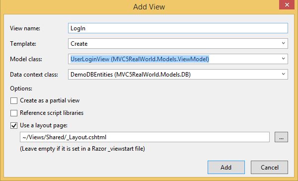 Before adding the view, be sure to build your application first to ensure that the application is error-free. After a successful build, navigate to the “AccountController” class and right-click on the Login action method and then select “Add View”. This will bring up the following dialog below: