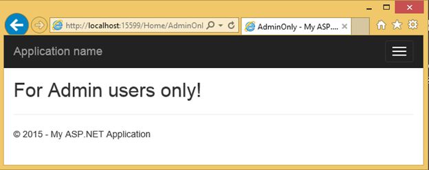 When logging in as an Admin user and accessing the following URL: http://localhost:15599/Home/AdminOnly