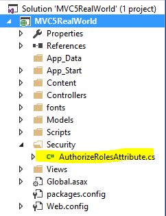 To start, add a new folder and name it “Security”. Then add the “AuthorizeRoleAttribute” class. The following is a screen shot of the structure: