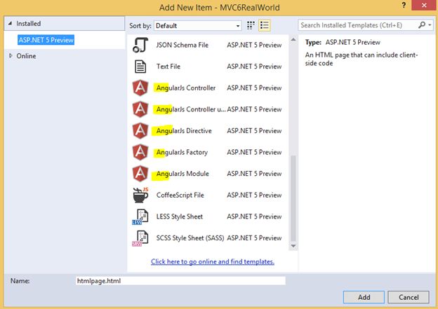 AngularJs is one of the most popular client-side frameworks for building Single Page Applications (SPAs). Visual Studio 2015 includes templates for creating AngularJs modules, controllers, directives and factories.