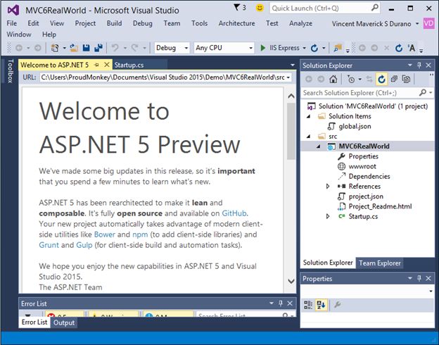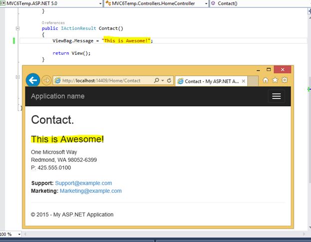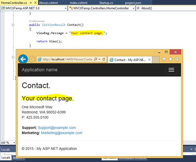 Another cool feature in Visual Studio 2015 is the ability to do dynamic compilation. In the previous versions of ASP.NET, when we change code in our application, we are required to compile and build the application every time we want to see the changes. In the new version of Visual Studio there's no need to do those extra steps anymore, instead you just need to save the file that you are modifying and then refresh the browser to see the changes.