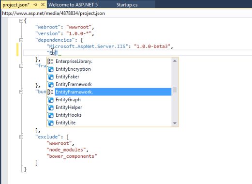 - project.json: contains project settings. In ASP.NET 5 you manage dependencies by adding Nuget packages using the NuGet Package Manager (NPM) or the new project.json file. This file enables you to easily manage dependencies in your application because you can edit it using any text editors. It would be easier to work with this file because in Visual Studio 2015, Intellisense will assist you in finding the available NuGet packages that you can add as dependencies.