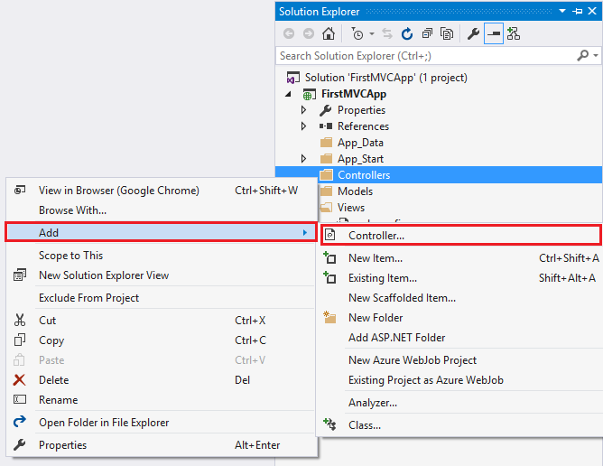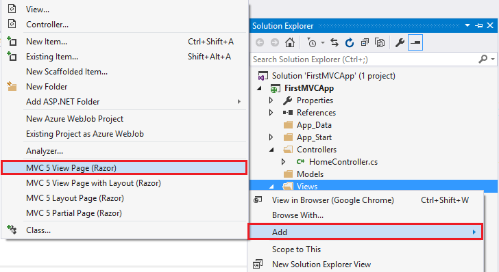 - The second option is to add a folder to the Views in the solutions with the same name as the controller and right-click on that and select the command add View.