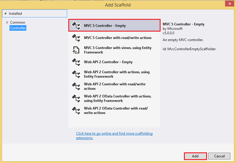 Select MVC 5 Controller. There is also some more controller templates also known as Scaffolder Templates that can bind directly with the Entity Framework and create all Action Methods to use CRUD operations. I am selecting Empty Controller from the template lists to write some basic action to test the first ASP.Net MVC application.