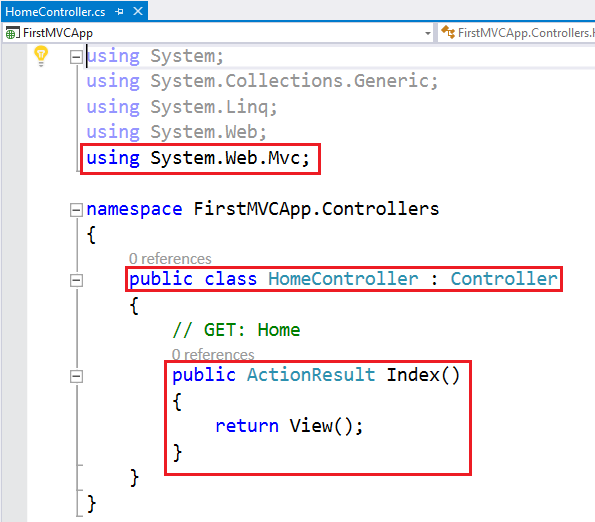 Every class inherits from the Controller Class in that namespace and that class has an Action method Index by default.
