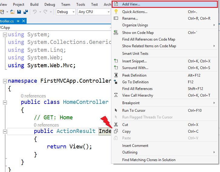 - Right-click on the Action Method Name and select the Add View command from the list.