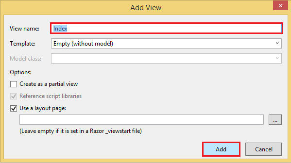 Provide a name for the view and also select a template to use a model object and for creating a view with a strongly typed bind you can select a layout page (Master page) for the UI. Finally click on Add and use the view.