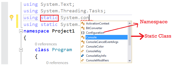 This is a new concept in C# 6.0 that allows us to use any class that is static as a namespace that is very usefull for every developer in that code file where we need to call the static methods from a static class like in a number of times we need to call many methods from Convert.ToInt32() or Console.Write(),Console.WriteLine() so we need to write the class name first then the method name every time in C# 5.0. In C# 6.0 however Microsoft announced a new behavior to our cs compiler that allows me to call all the static methods from the static class without the name of the classes because now we need to first use our static class name in starting with all the namespaces.