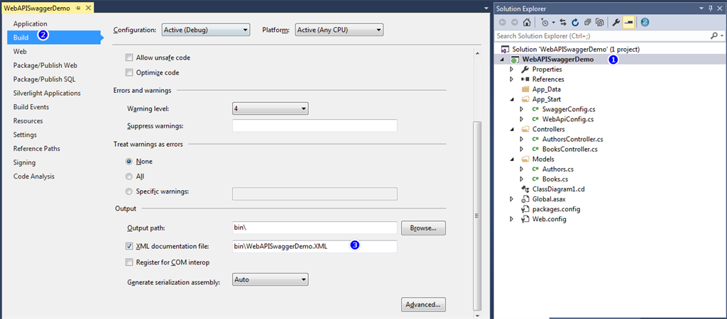 The API controller classes have XML documentation written on all action methods, we need to generate XML file for Swagger to read them while running application.