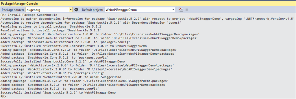 Install-Package Swashbuckle. This will install the necessary packages to our Web API project as shown below: