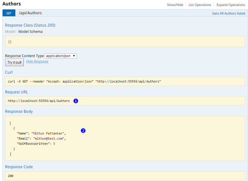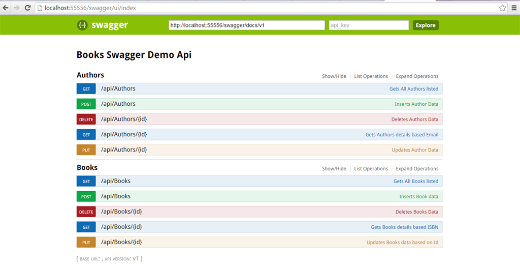 Here is the First look of Web API using Swagger UI, isn't it wonderful !!! It lists all controllers in our web Api project, we have "Books" and "Authors" controllers written.
