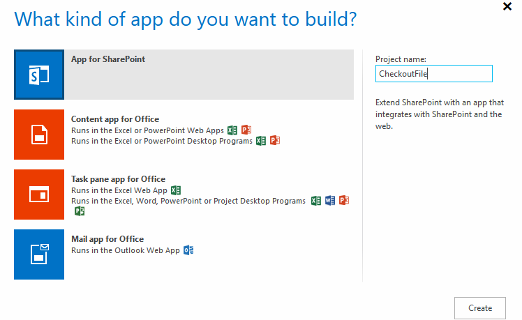 - Choose the App for SharePoint template, name the project Create Site and then choose the Create button.