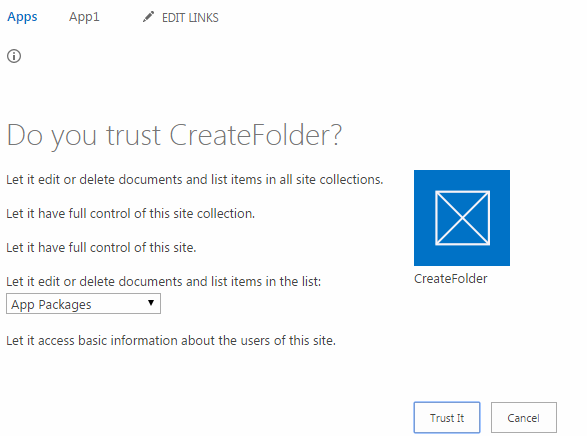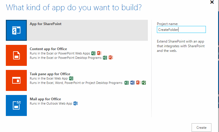 - Choose the App for SharePoint template, name the project Create Site and then choose the Create button.