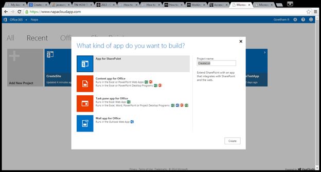 - Choose the App for SharePoint template, name the project Create Site and then choose the Create button.