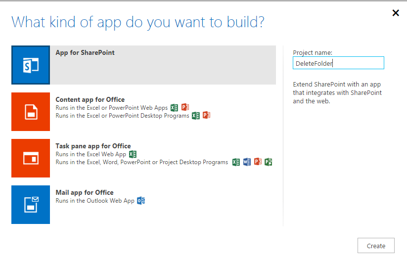 - Choose the App for SharePoint template, name the project Create Site and then choose the Create button