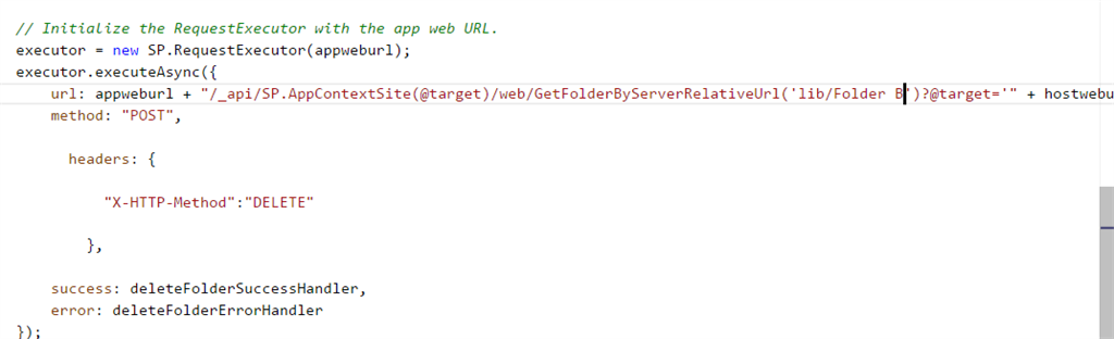 -    url: appweburl + "/_api/SP.AppContextSite(@target)/web/GetFolderByServerRelativeUrl('lib/Folder B')?@target='" + hostweburl + "'",