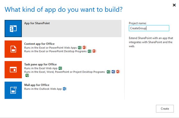 - Choose the App for SharePoint template, name the project Create Site and then choose the Create button.
