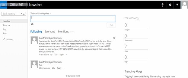Th example in this article shows how to retrieve My Feeds in SharePoint using the REST API. Develop the project using the following method in the NAPA Tool.