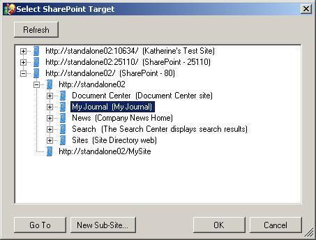By clicking the Select button, the site sector window opens. The site selector shows existing and planned SharePoint sites and sub sites in a tree. The planned sites are indicated using a Green plus sign icon.