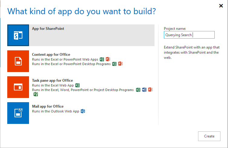 - Choose the App for SharePoint template, name the project Create Site and then choose the Create button