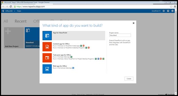 - On your Developer Site, open the "Napa" Office 365 Development Tools and then choose Add New Project.