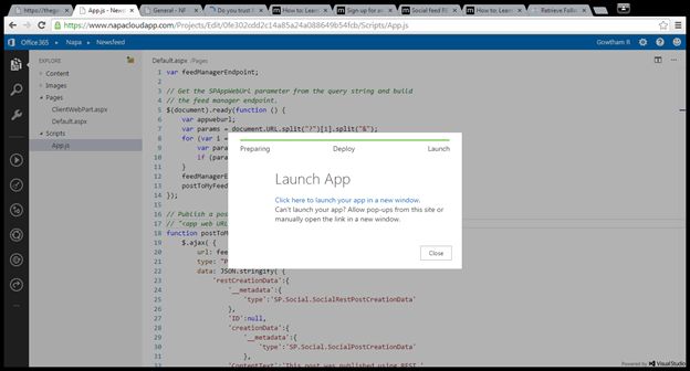 After deploying the app select the Click here to launch your app in new window link and it will redirect to another page.