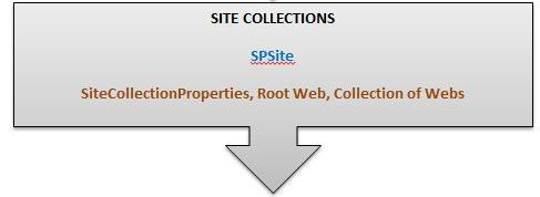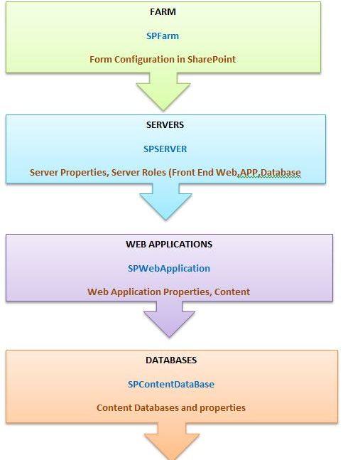 SPFarm: The SPFarm object is the highest object within the Windows SharePoint Services object model hierarchy. The servers property gets a collection representing all the servers in the deployment and the services property gets a collection representing all the services.SP SERVER: The Server object represents a physical server computer. The service instances property provides access to the set of individual service instances that run on the individual computer.SPWebApplication: Each SPWebApplication object represents a load-balanced web application based in Internet Information Services (IIS). The SPWebApplication object provides access to credentials and other server Farm-wide application settings. The Sites property gets the collection of site collections within the web application and theContentDatabases property collection of content databases is used in the web application. The SPWebApplication class replaces the obsolete SPVirtualServer class but it can still be helpful to think of a SPWebApplication object as a virtual server; that is, a set of one or more physical servers that appear as a single server to users.SP Content Database: the SPContentDatabase object inherits from the Database class and represents a database that contains user data for a SharePoint web application. The Sites property gets the collection of site collections for which the content database stores data and the WebApplication property gets the parent web application.SPSiteCollection: An SPSiteCollection object represents the collection of site collections within the web application. The Item property or indexer gets a specified site collection from the collection and the Add method creates a site collection within the collection.SPWEB: Each site collection includes any number of SPWeb objects and each object has members that can be used to manage a site, including its template and theme, as well as to access files and folders on the site.SPLIST: Each SPList object has members that are used to manage the list or access items in the list.ITEMS: Each SPListItem object represents a single row in the list.Reference:MSDN