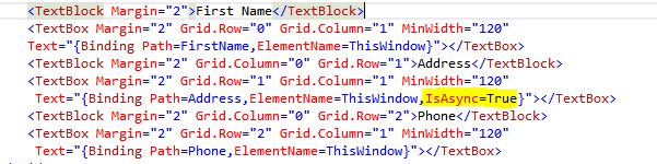 Inside the address's set/get block there is a Thread.Sleep(). When running the application, we can see a delay for loading the elements in the UI. Let me change the synchronous binding to asynchronous binding.
