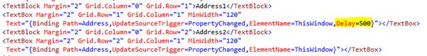For a delay demonstration, I have commented the Thread.Sleep() in the get/set block of the address property and in the XAML we can see our address property bound with two Text Boxes. I have added one delay inside the address property that is highlighted in the image below.