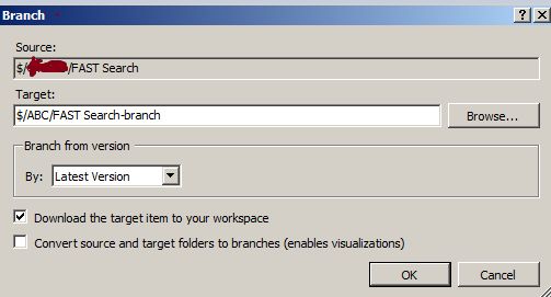 Once you clicked on Branch it will open a prompt window and set the Target location and leave the defaults. I think we can uncheck the second check box, in other words Convert source and target folders to branches, then click on the OK button.