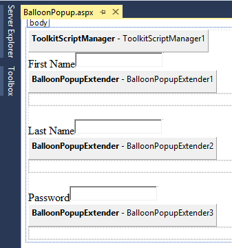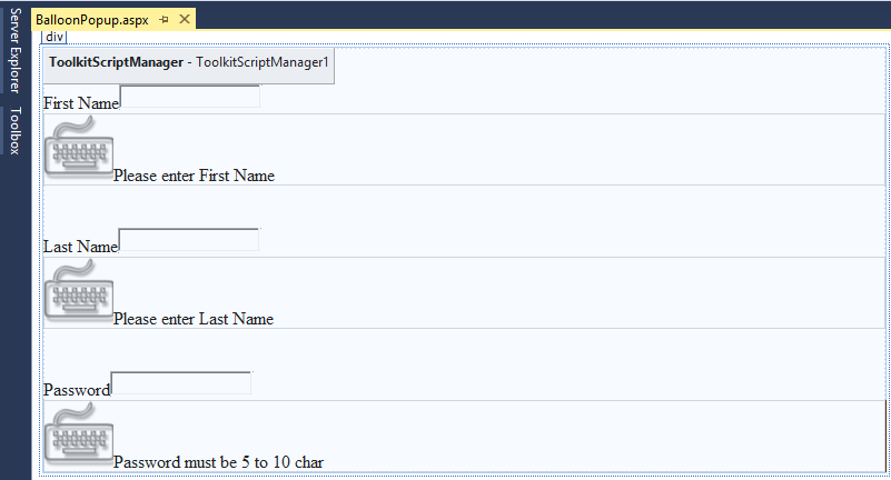 Step 4: Now we will add a Lable control and a BalloonPopupExtender next to the TextBox control for which we want to display the Balloon Popup. It requires a Panel control that contains its content.