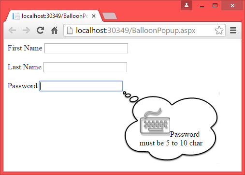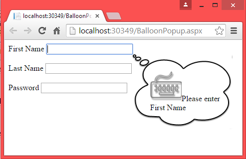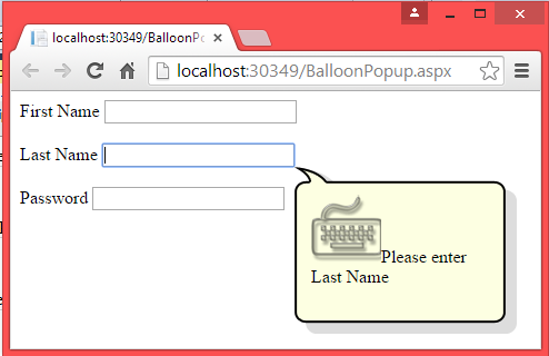 The BalloonPopupExtender control is used to display a popup that can contain any content. Here we will see an example to display help information or we can say a message when we move the focus to a TextBox control.
