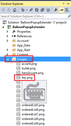 Step 5: Now we will provide some properties for the BalloonPopupExtender by which we will get the desired output. Here we will use the image "key.png" inside the panel control so we need to put this image inside the images folder.