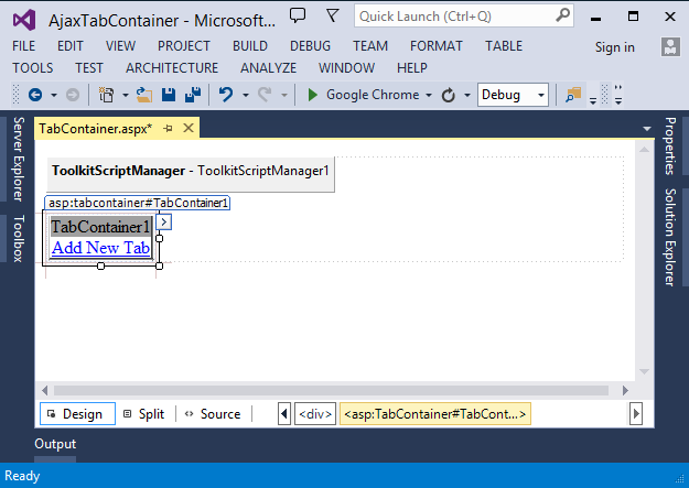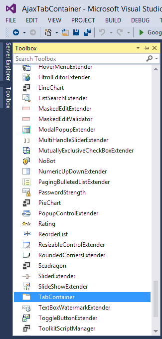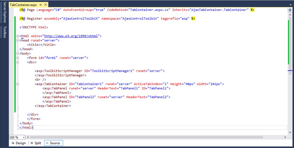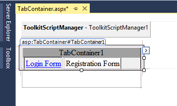 We will now select a TabContainer control from the ajax controls pane and add it after the ToolKitScriptManager.