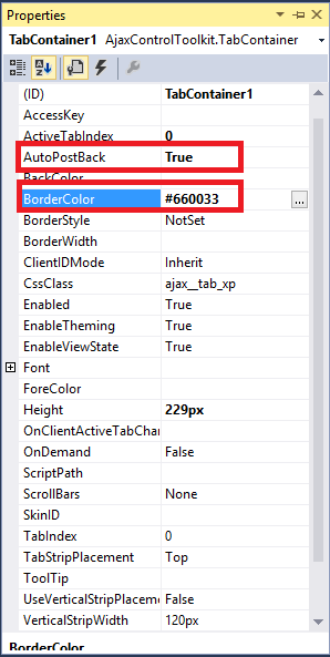 Step 8: Now we will set some properties like AutoPostBack and BorderColor for the Tab Container.