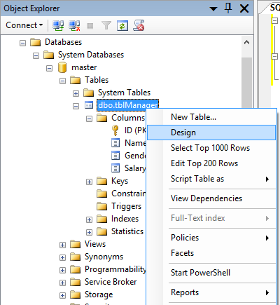 Step 1: Now one way to do that is within the Object Explorer. Right-click on the table tblManager then click on the Design option.
