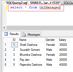 - Insert into tblManager values('Shaili Dashora','Female','30000')