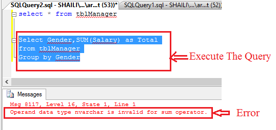 Here the error message says "Operand data type nvarchar is invalid for sum operator" So we cannot use the Salary column with the SUM aggregate function, because its DataType is nvarchar.