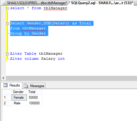 Now after the execution of this query we will execute the previous query to list the total salaries of Managers grouped by Gender like this: