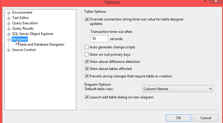 Now in the option window expand Designers and under that "Table and Database Designers" and uncheck the check box "Prevent saving changes that require table re-creation" then click OK.