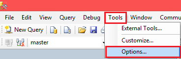 So to do that go to SQL Server and within Tools select Options.