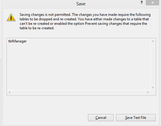Option 2: Disable "Prevent saving changes that require table re-creation" option within SQLServer, this option is ON by default within SQL Server so we need to disable this option.