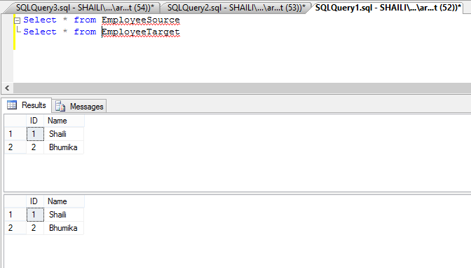 Notice that the Shaili record is updated and the Bhumika record is inserted and the Sourabh record is not deleted in the EmployeeTarget table.