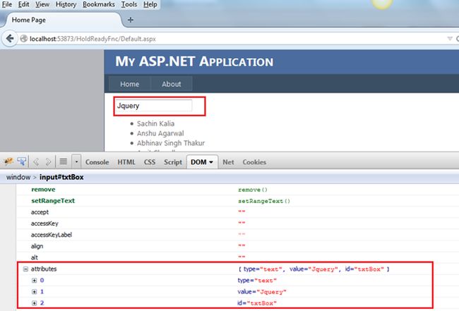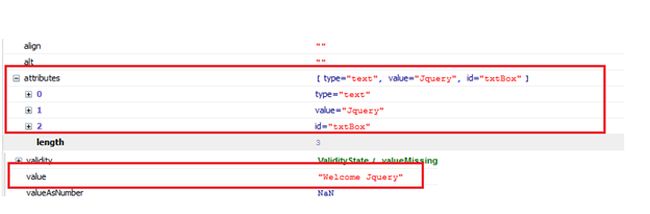 Now I changed the value at runtime and see the attributes and properties. I've put Welcome jQuery in the textbox. Now see that the attribute value is still jQuery while the value property has been changed to Welcome jQuery.