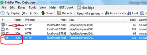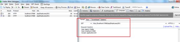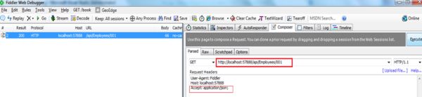 Open the Web proxy tool Fiddler and paste the following URL (http://localhost:57888/api/Employees/001) into the composer tab and specify Accept: application/json in the Request Headers text box.