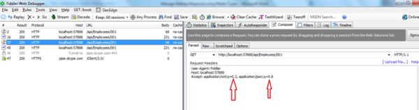 Open the Web proxy tool Fiddler and paste the following URL (http://localhost:57888/api/Employees/001) in the composer tab and specify Accept: application/xml;q=0.2, application/json;q=0.8 in the Request Headers text box.