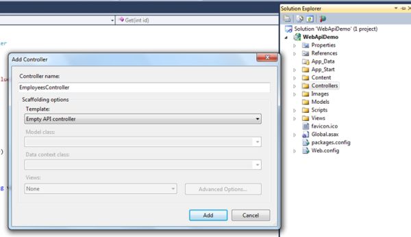 Step 4: Right-click the Controllers folder in the Solution Explorer of Visual Studio. Select Add ➤Controller and provide a name of EmployeesController for the controller. Leave the option Empty API Controller selected in the Template dropdown and click Add, as shown in Figure below. Notice that the generated controller class inherits from ApiController, a class that is part of the ASP.NET Web API framework.Kinldy add the following code into EmployeesController class.