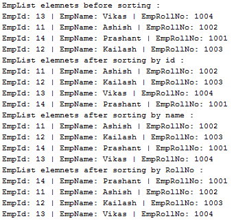 System.out.println("EmpList elemnets after sorting by RollNO :");